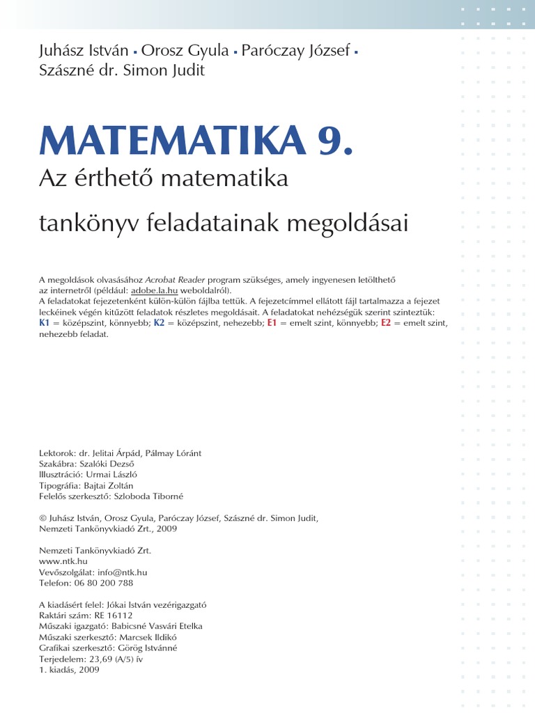 érthető matematika 9 osztály tankönyv megoldások. Matematika tananyag kilencedik osztályos diákok számára. Mivel a szerzők maguk is gyakorló matematika tanárok a gimnáziumi könyvek írói. Sokszínű matematika 9. Jelenleg elérhető az érthető matematika sorozatból a 9.
