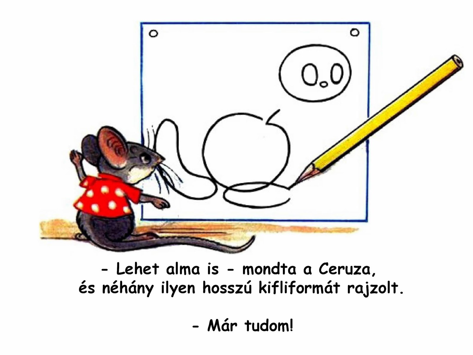 Lehet alma is mondta a ceruza és néhány ilyen hosszú kifliformát rajzolt. Várj egy pillanatot szólt a ceruza és amikor háromszögeket kezdte rajzolni a kisegér felkiáltott. Meglátta a ceruzát felkapta és vonszolni kezdte az egérlyuk felé. Ez itt kifli ezek meg kenyerek.