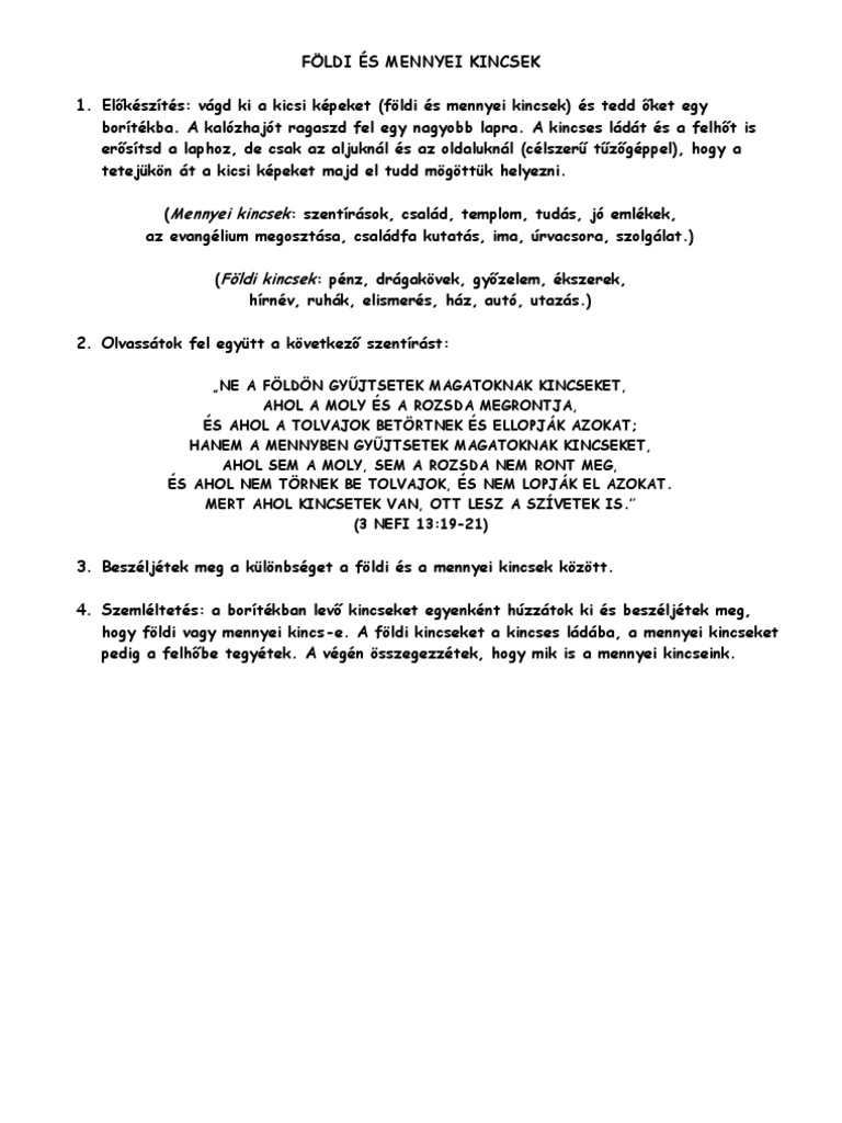 Hanem gyűjtsetek magatoknak kincseket mennyben a hol sem a rozsda sem a moly meg nem emészti és a hol a tolvajok ki nem ássák sem el nem lopják. Az apostolok ezt tették és ez legyen a mi ismertetőjelünk is. Ne gyűjtsetek magatoknak kincseket a földön hol a rozsda és a moly megemészti és a hol a tolvajok kiássák és ellopják. Mert ahol a kincsed van ott lesz a szíved is.